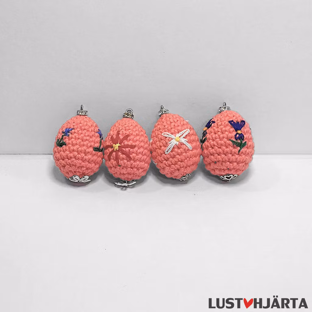 Fina virkade små påskägg med broderier och silverfärgade smyckesdetaljer. Varje ägg är handgjort och en unik och elegant påskdekoration. De små äggen är perfekta för att lyfta din påskdukning eller som vackra gåvor till nära och kära.