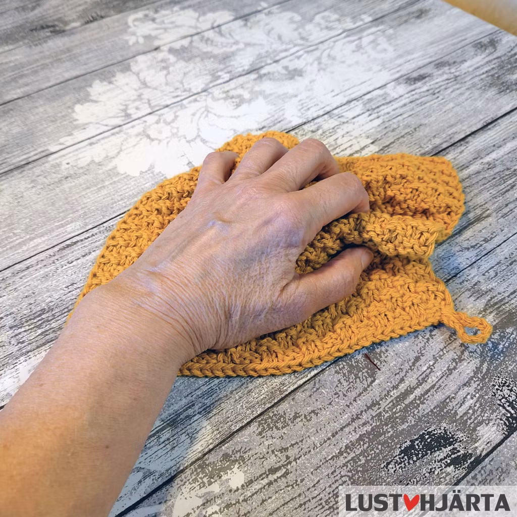 Strukturen på virkade och stickade disktrasor fångar upp smulor och annat på ett effektivt sätt. Den gör det även enklare att gnugga bort fläckar.
