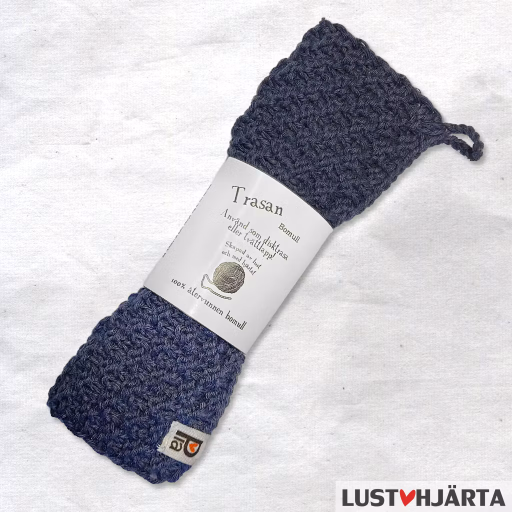 En handstickad mörkblå disktrasa som kan tvättas i maskin och håller länge - inget slit och släng.