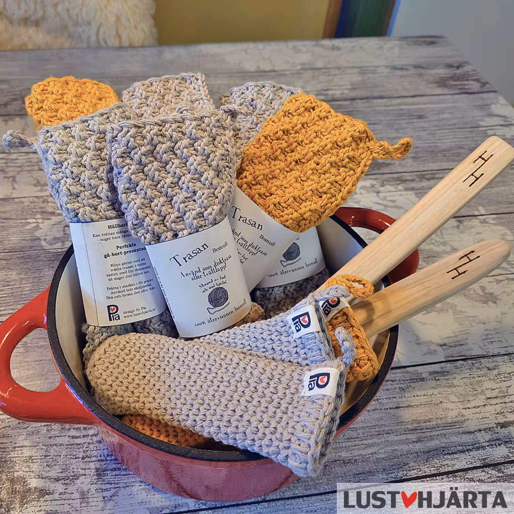 Tvätta handtagsskyddet i maskin i 40-60 grader. Använd inte sköljmedel och undvik torktumling eftersom det sliter onödigt mycket på alla textilier. Sätt gärna skyddet på en stekpanna när det är vått ifall det har krympt i tvätten.