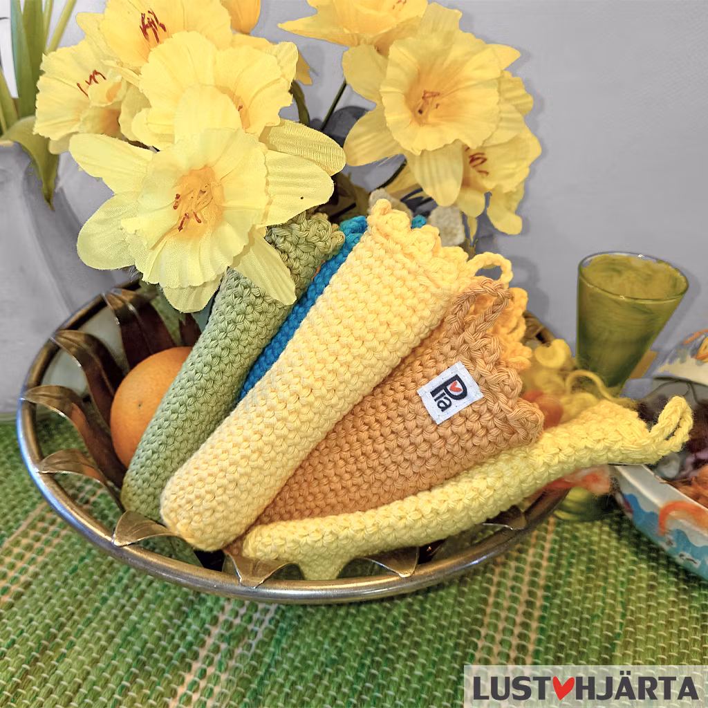 Tvätta handtagsskyddet i maskin i 40-60 grader. Använd inte sköljmedel och undvik torktumling eftersom det sliter onödigt mycket på alla textilier. Sätt gärna skyddet på en stekpanna när det är vått ifall det har krympt i tvätten.
