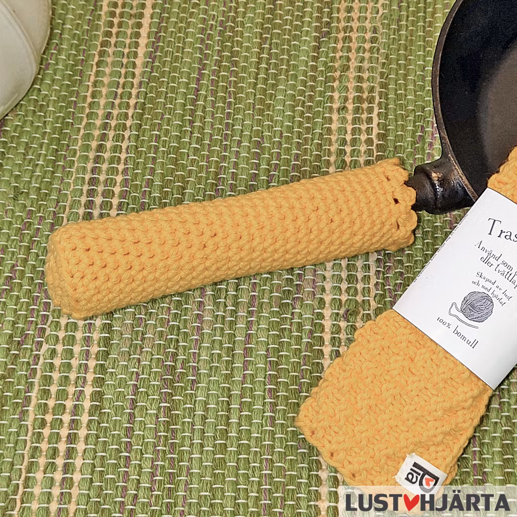 Ett virkat handtagsskydd för stekpannan så du slipper bränna dig när du steker pannkakor.
