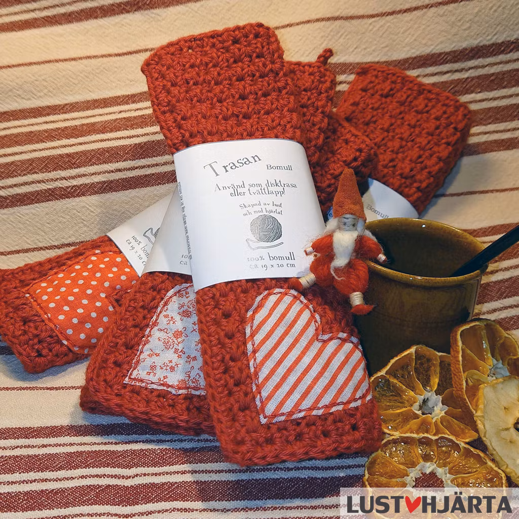 Den här virkade disktrasan finns i samlingen JULTRASAN. Just den här är julröd med ett hjärta som dekoration. Det finns även grangröna, pepparkaksbruna, julröda, gräddvita, randiga, odekorerade. Finns även jultrasor i en blandning av bambu och bomull.