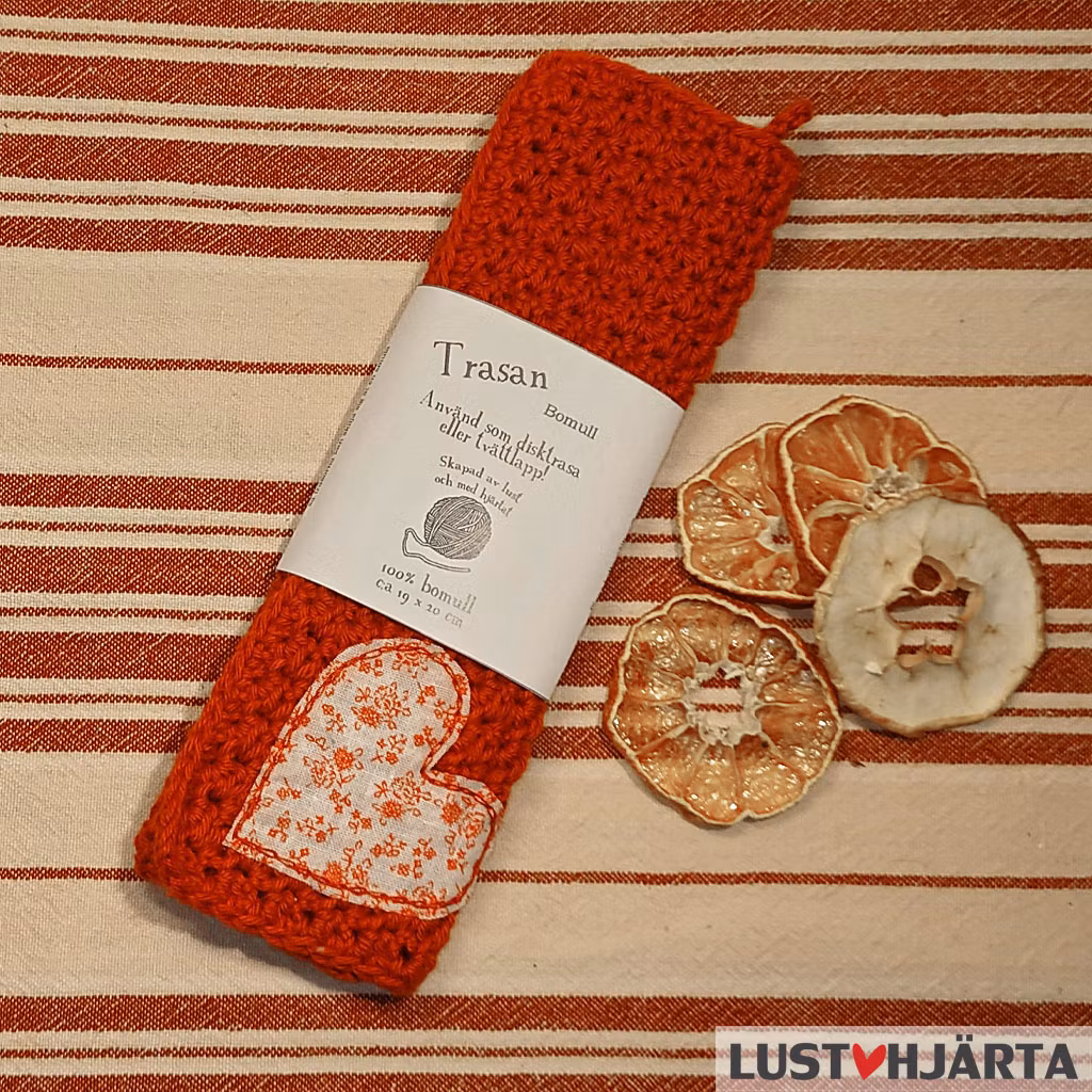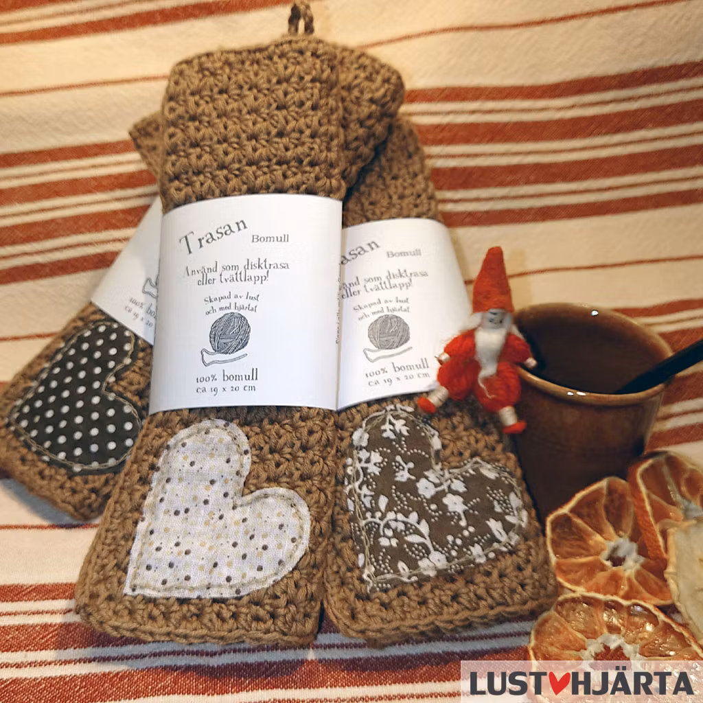 Den här disktrasan är inte lika tålig som de vanliga trasorna eftersom den har en fastsydd applikation. När du använder den här disktrasan kan det också vara bra att inte vrida för hårt om det applicerade hjärtat. Därför kanske du inte använder den här disktrasan till väldigt smutsigt bord eller diskbänk, kanske har du den lite mer som en juldekoration =)