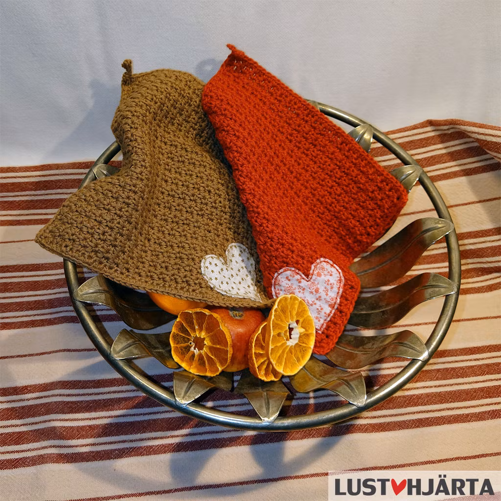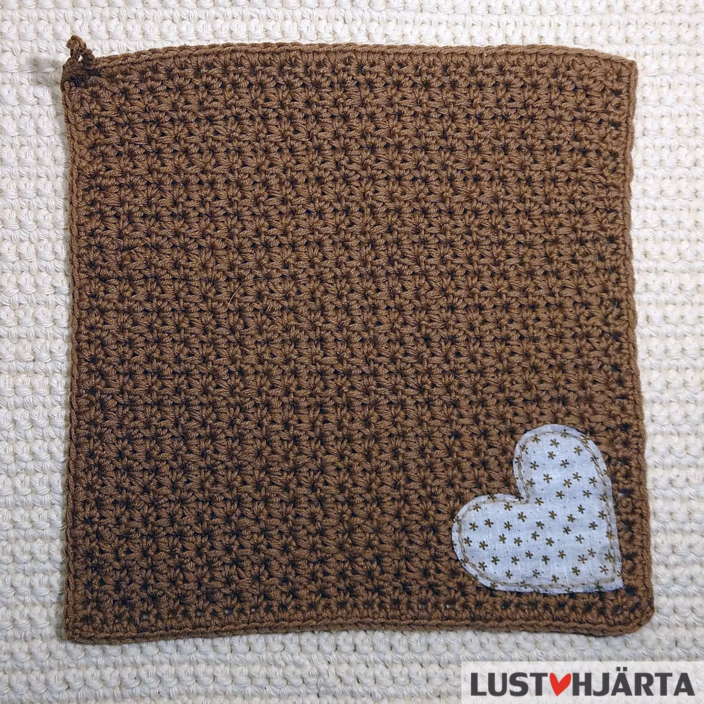 Den här disktrasan är inte lika tålig som de vanliga trasorna eftersom den har en fastsydd applikation. När du använder den här disktrasan kan det också vara bra att inte vrida för hårt om det applicerade hjärtat. Därför kanske du inte använder den här disktrasan till väldigt smutsigt bord eller diskbänk, kanske har du den lite mer som en juldekoration =)